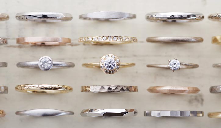 シンプルなフォルムから個性的なアレンジまで、幅広い結婚指輪をオーダーいただけます。数千種類以上のサンプルと制作事例からお好きなものを探したり、デザインイメージが見つからなくてもスタッフがおふたりにぴったりな結婚指輪をご提案いたします。