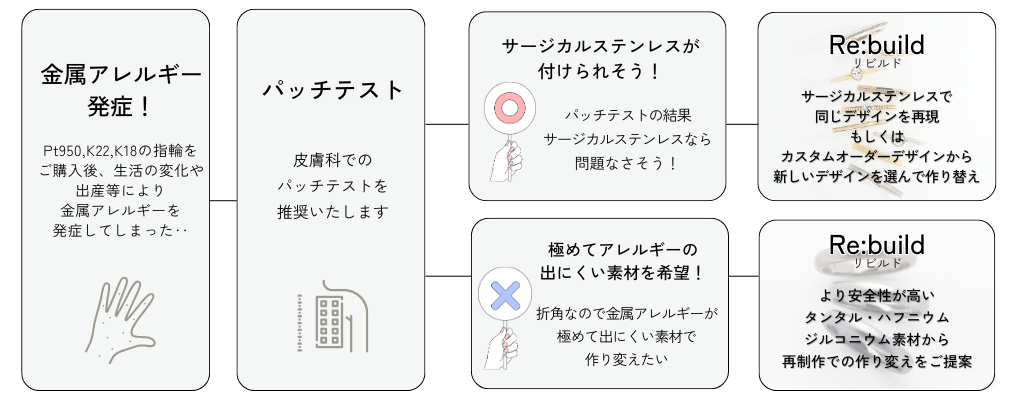 金属アレルギーかもしれないと不安を持つお客様に、万が一金属アレルギーが発症してしまった場合、お作り頂いた指輪の同デザインを【サージカルステンレス】もしくは、金属アレルギーに対して最も安心できる【タンタル・ハフニウム・ジルコニウム】で作り直しするサービスをご用意しております。