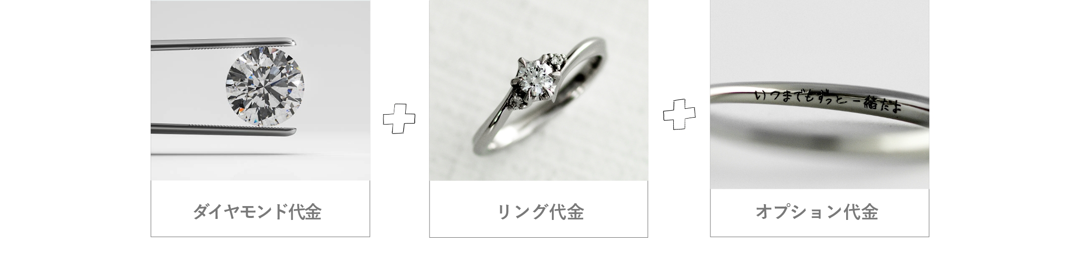 カスタムオーダーは【ダイヤモンド代金】+【リング代金】+【オプション費】の合計=価格となります。
