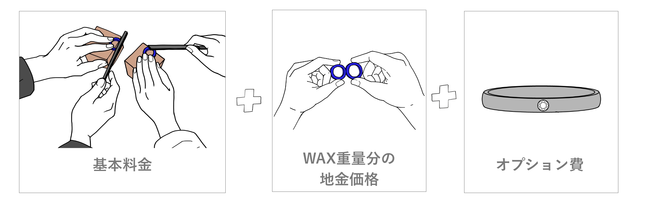 プレミアムコースは【制作費(¥16,500)】+【お作り頂いたWAXの重量】+【オプション費】の3項目の合計=価格となります。